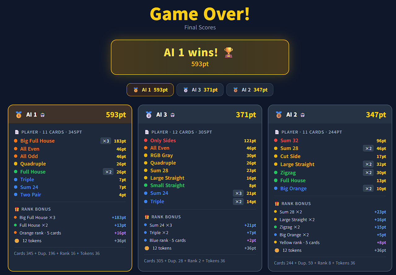 - 총점이 가장 높은 플레이어가 승리합니다.
