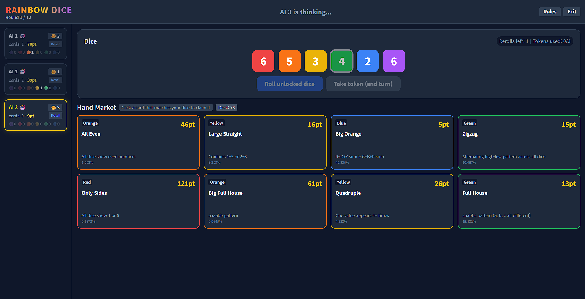 - Buy 1 card from the Hand Market that matches your dice. (Spend 3 extra tokens to buy one more).