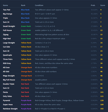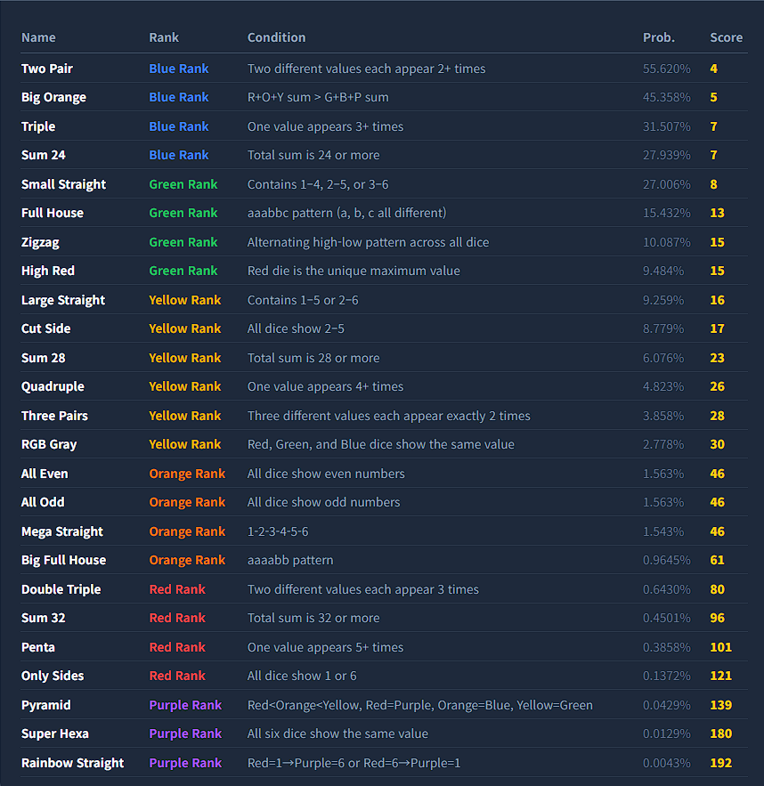 - Card Color: Represents the "Rank" of the hand. There are 6 ranks: Blue (lowest), Green, Yellow, Orange, Red, and Purple (highest). Ranks are determined by the probability of rolling that hand in a single throw of 6 dice; the rarer the hand, the higher the rank.