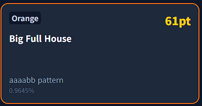 - 동일한 족보 카드가 2/3/4/5장 이상 있다면 족보 카드의 점수의 1배/2배/4배/8배에 대응하는 보너스 점수를 얻습니다. 6장 이상은 5장과 동일하게 계산합니다.